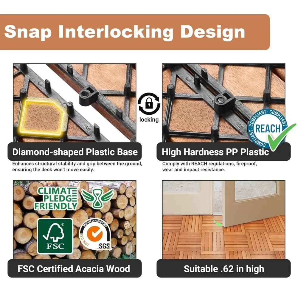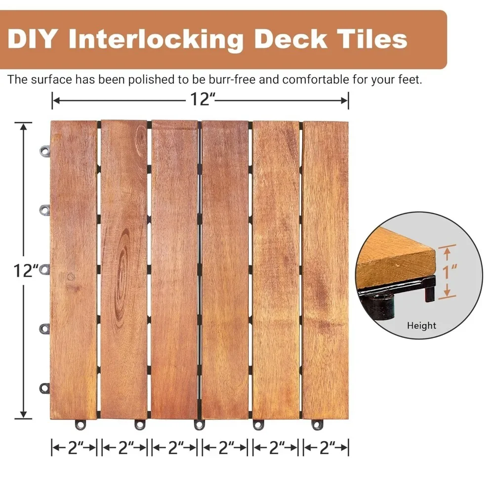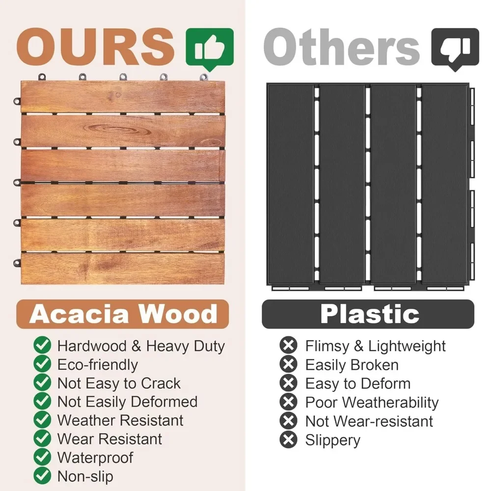 interlocking deck tiles use solid FSC Certified Acacia Wood, adhering to the business philosophy of Protecting Forestry, Socially Beneficial, Economic Viable. Acacia wood is a hardwood with high hardness and good stability, is not easy to deform, and is resistant to impact and friction.