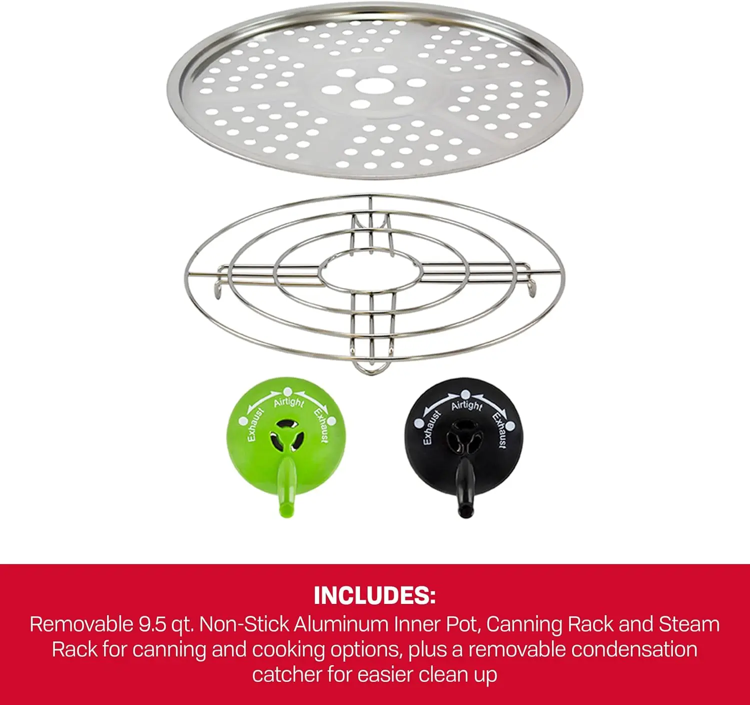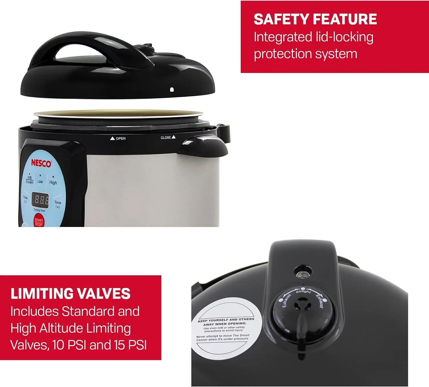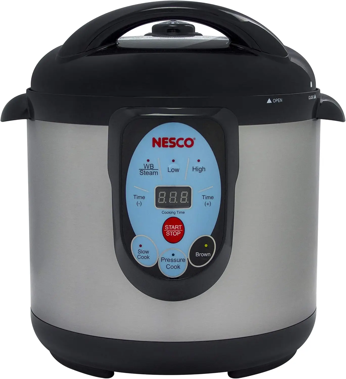 The NESCO NPC-9 Smart Canner & cooker creates a perfect balance between safety, performance, and versatility and will soon become one of your favorite kitchen appliances. Designed to eliminate the common mistakes that cause harm or spoil food during the canning process. The smart Canner & cooker gives users uncompromised safety and peace of mind. Multiple built-in safety features control and regulate the pressure continuously and allow you to can and cook without worry. The multi-functional digital display and pre-set programs give you the right tools to ensure consistent results when canning fruits, jams, pickles, salsas and more. The safety lock lid with automatic float valve ensures that the lid fits correctly and identifies when pressure is present. Water bath and pressure functions take the guesswork out of the equation and simplify the ability to can your harvest. The removable 9.5 qt. Non-stick cooking chamber is dishwasher safe and can hold and process four quart (wide-mouth), five pint or sixteen 4 oz. Jelly jars at a time. The durable stainless-steel body is light-weight and has side handles for safe handling. The NESCO Smart Canner & cooker also prepares your favorite slow-cooked recipes faster and makes healthy, delicious meals with a touch of a button. Easy to clean and perfect for quick and efficient pressure/slow cooking, browning, steaming vegetables and cooking rice. Additional accessories include a canning rack and steam rack for canning and cooking options and a removable condensation catcher for easier clean up. Can the safe way with the NESCO Smart Canner and Cooker.