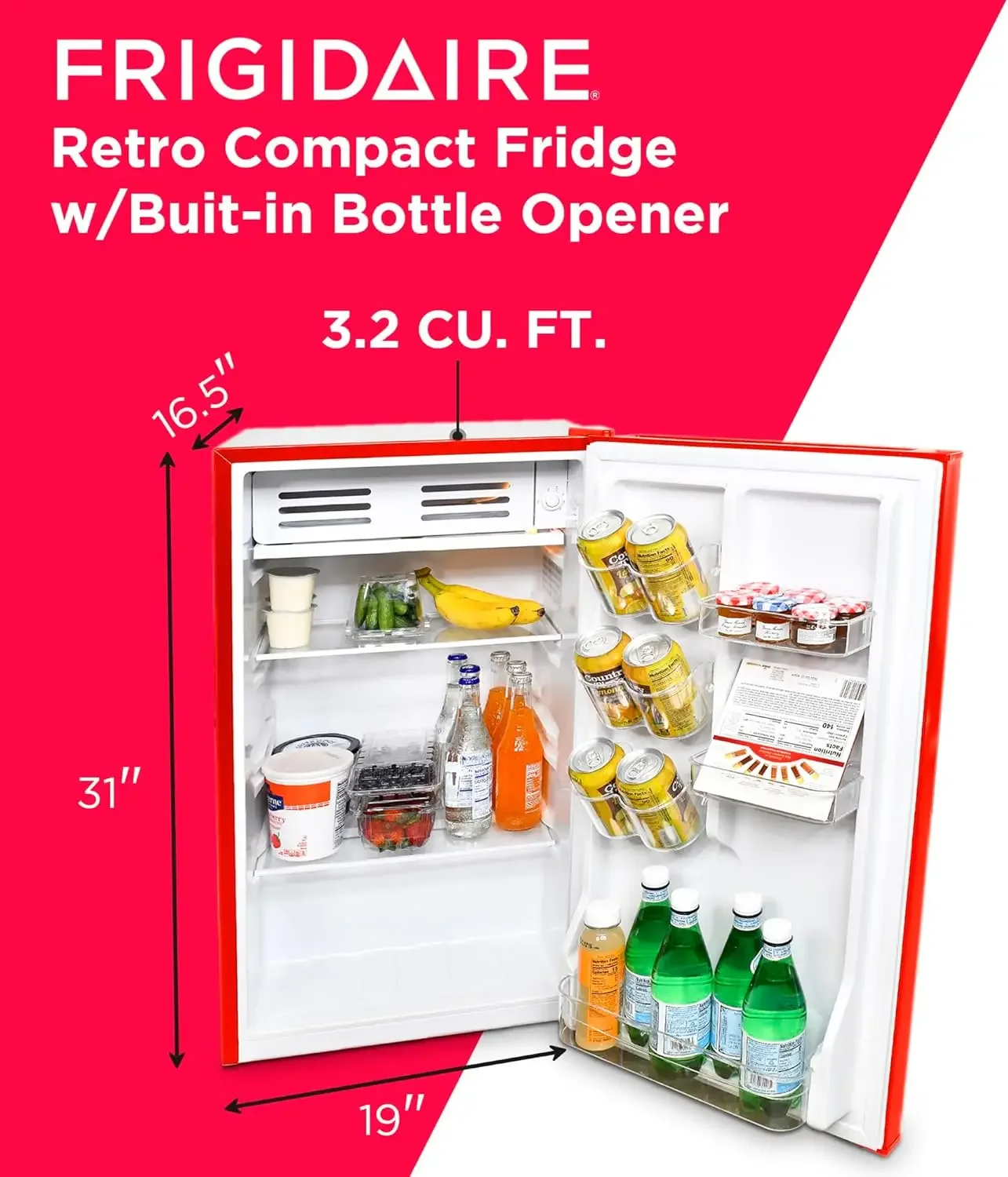 Welcome to the world of quality built, affordable kitchen products. Introducing the beautiful retro 3.2 CU. FT compact refrigerator! This refrigerator is at the next level! The fridge is happy hour ready with an attached bottle opener, chrome pull handle and removable glass shelves which makes it perfect for an easy clean up. The interior freezer compartment will keep any leftovers nice and fresh, a gallon door bin with adjustable temperature control so you can keep your white wine nice and chilly, and if you’re not a wine person, have no fear, there’s a dispense-a-can for all your soda and beer needs. All this for an affordable price.